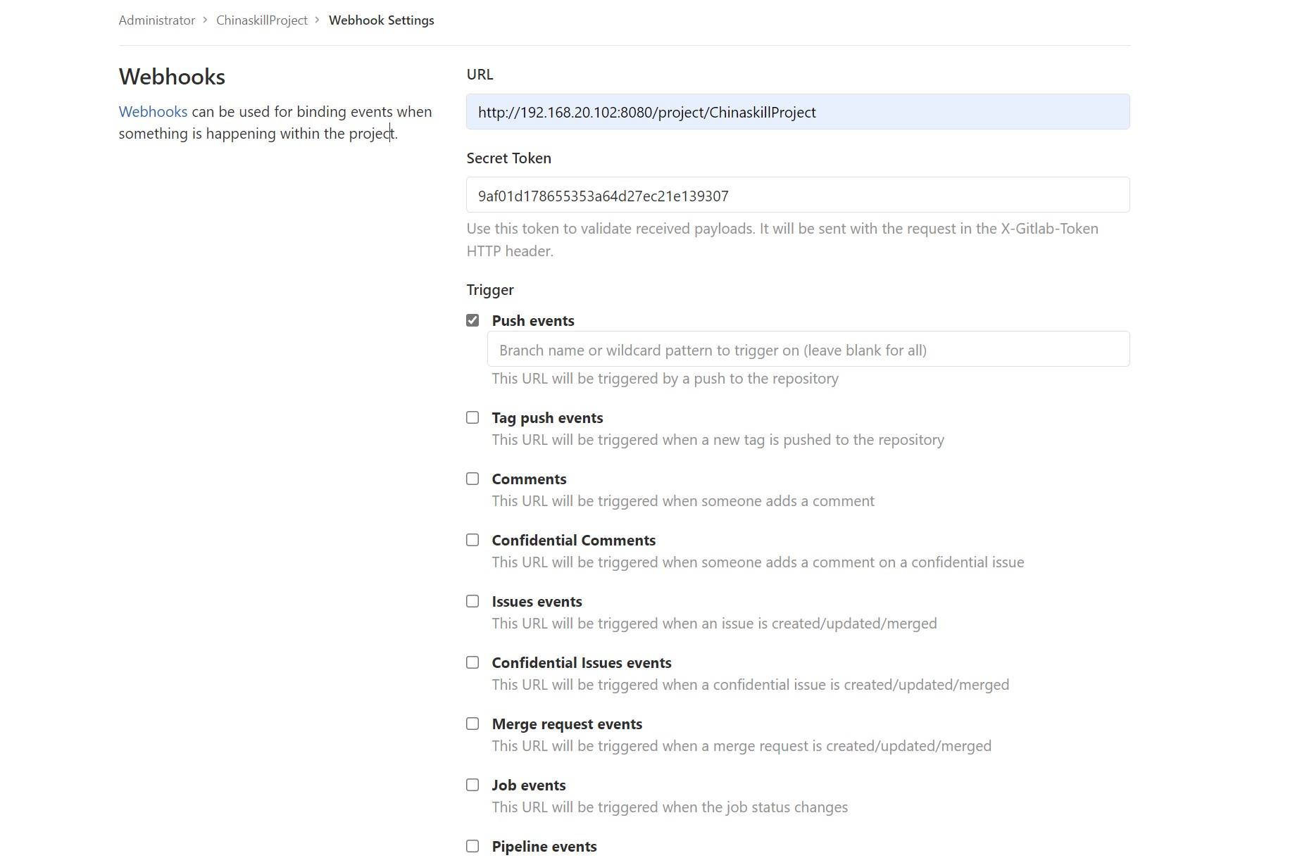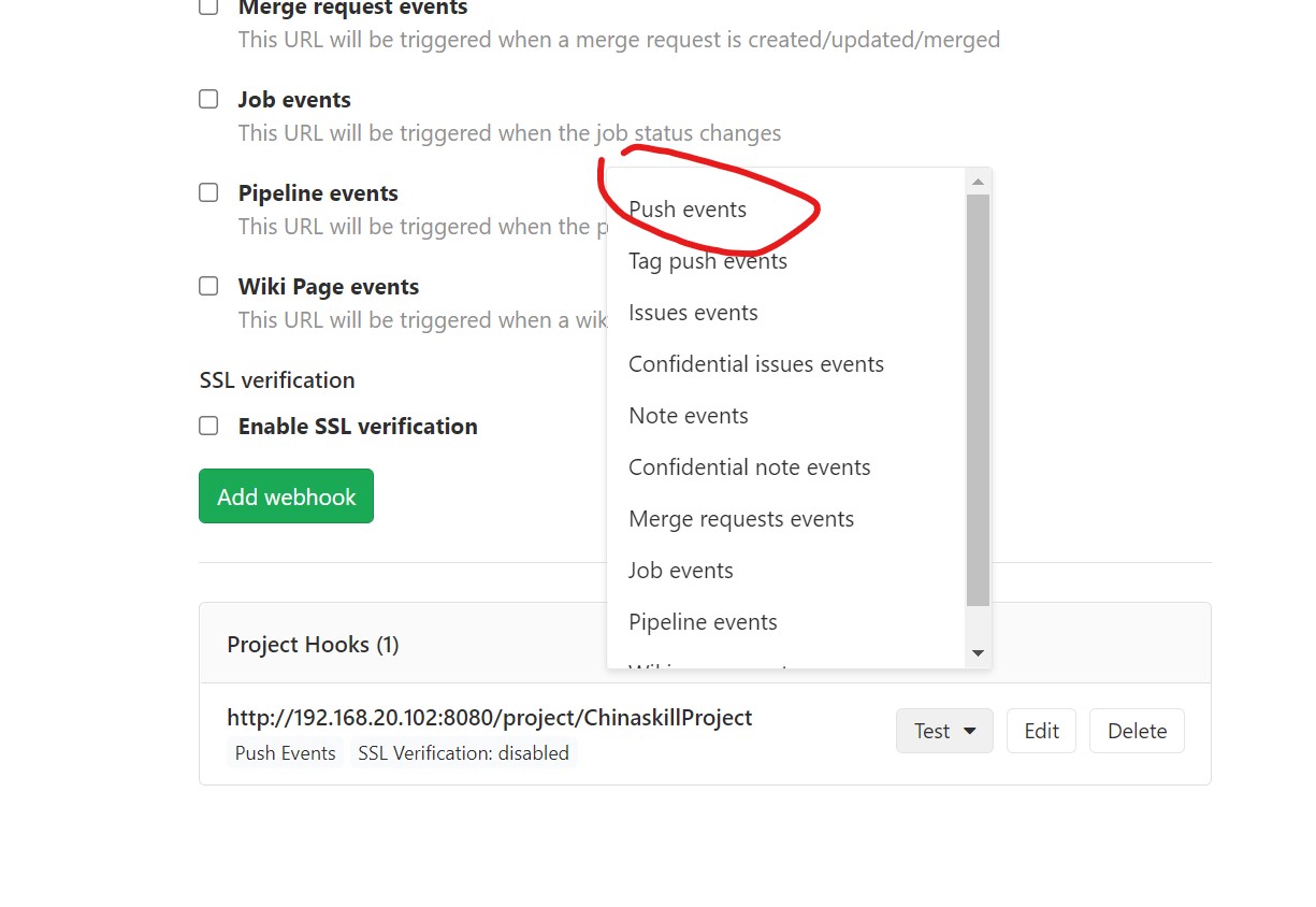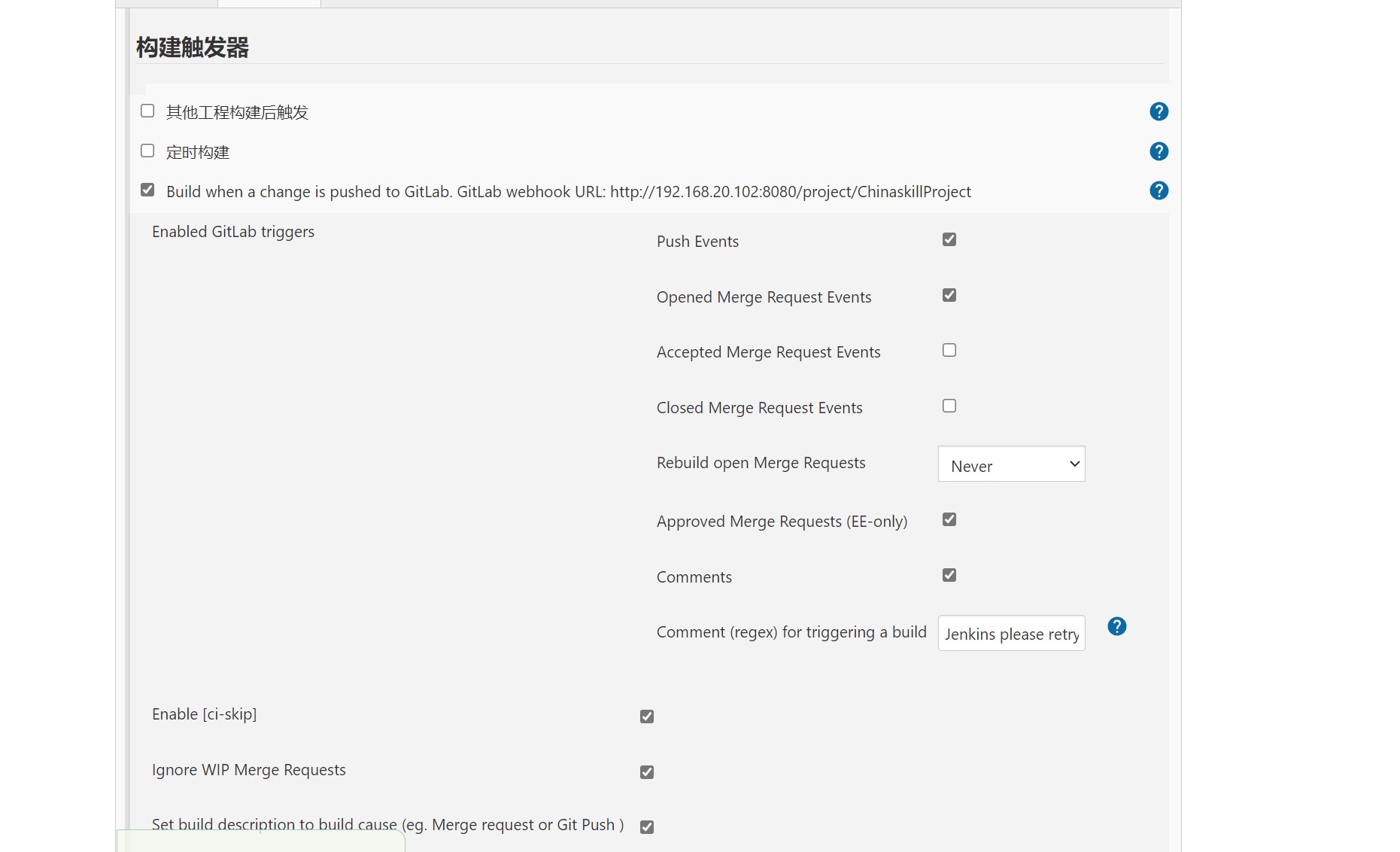 勾选Build when a change is pushed to GitLab. GitLab webhook URL: http://192.168.20.102:8080/project/ChinaskillProject