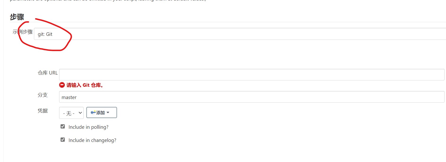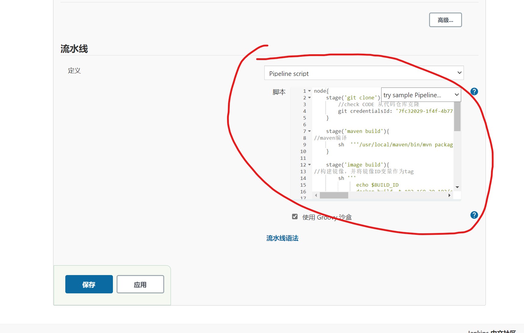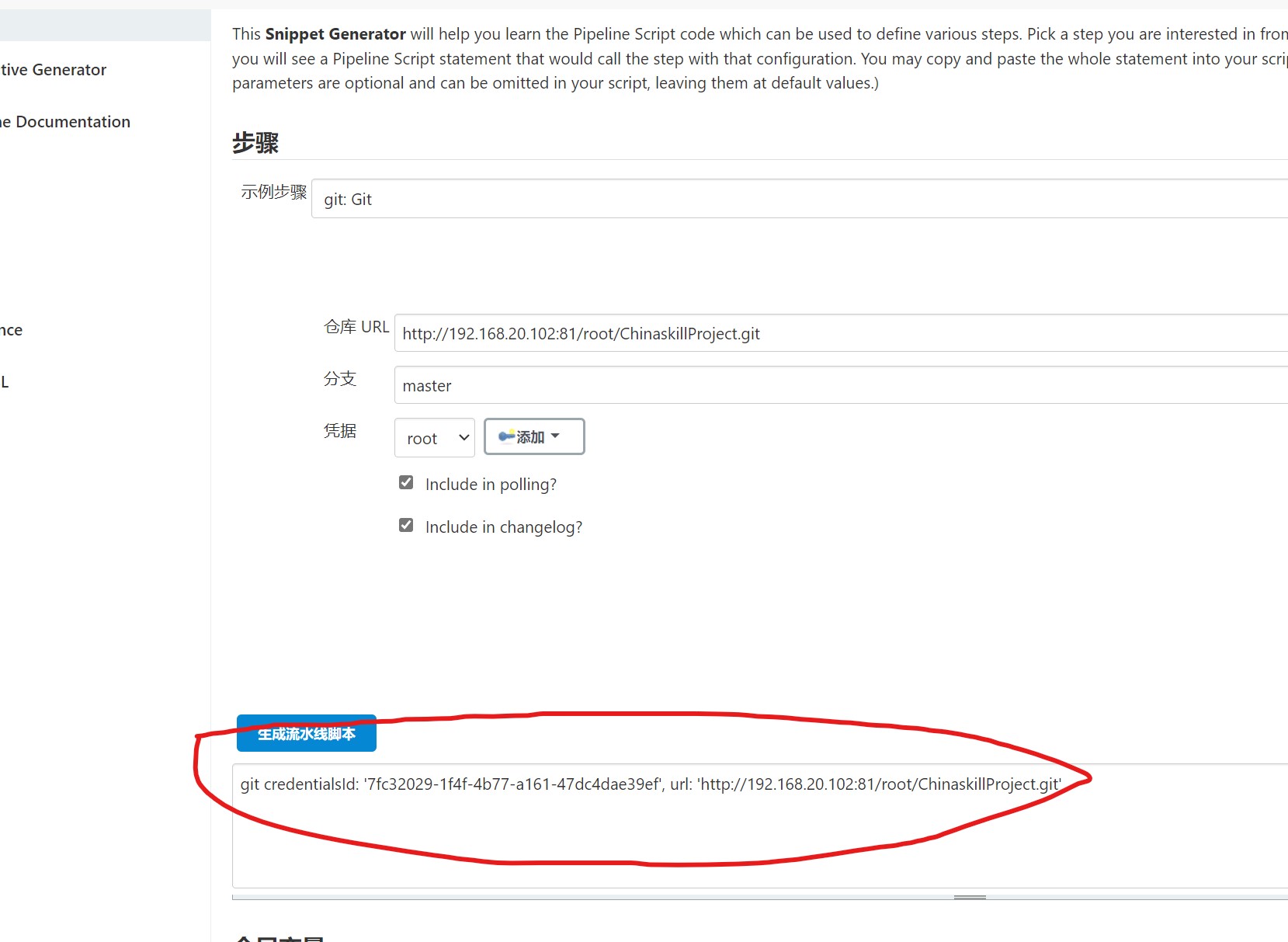| node{ stage('git clone'){ //check CODE 从代码仓库克隆 git credentialsId: '7fc32029-1f4f-4b77-a161-47dc4dae39ef', url: 'http://192.168.20.102:81/root/ChinaskillProject.git' }