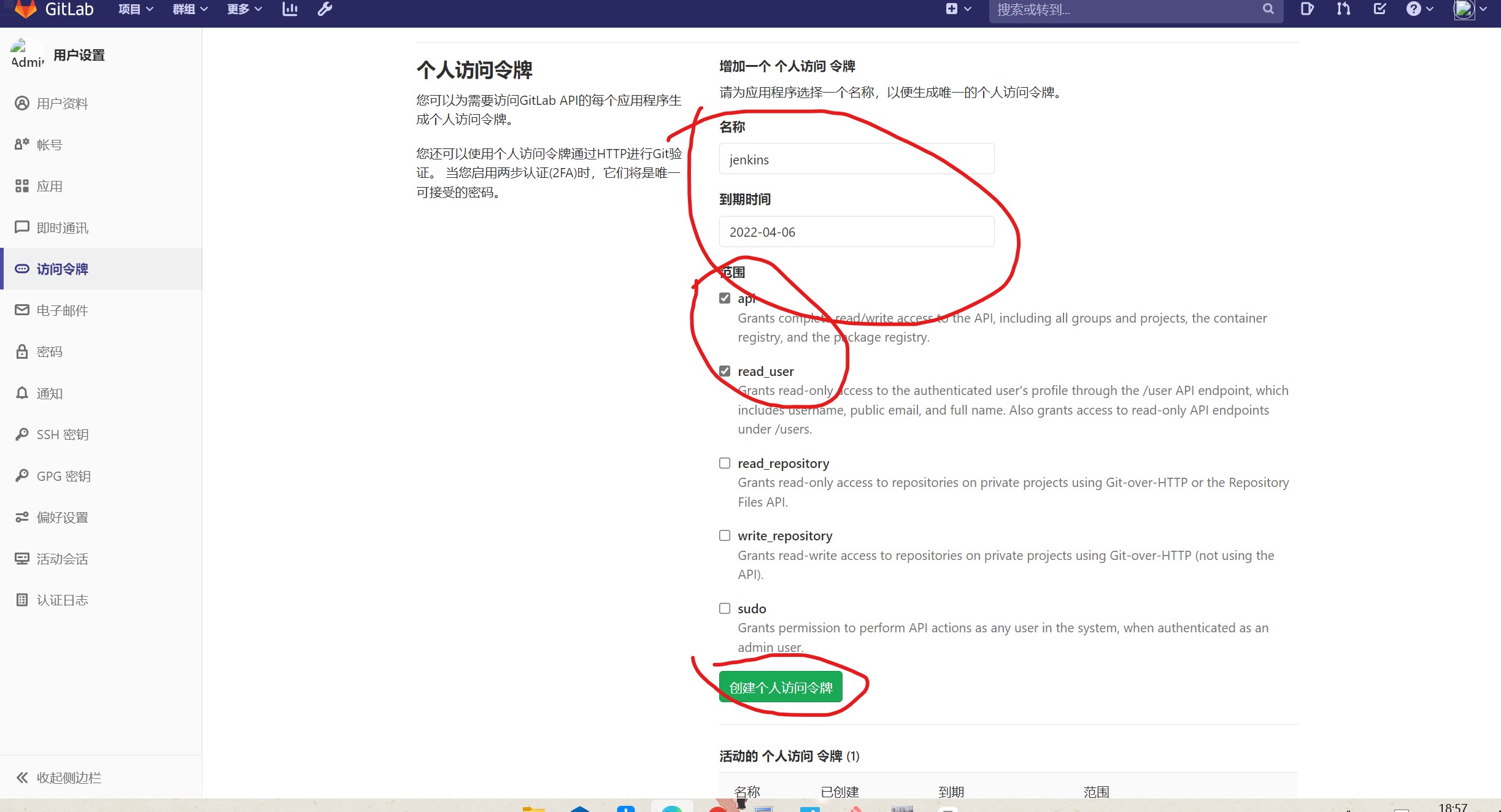 (2)生成“Access Tokens”并命名为jenkins;